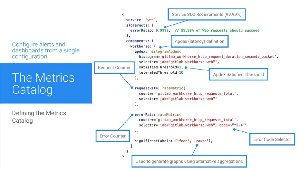 Prometheus, Grafana & Co. are really nice tools, but their configuration needs to be maintained and integrated well. For this purpose, Gitlab developed the “Metrics Catalog”: a single source-of-truth that manages metrics, SLAs, alerting rules and dashboards.