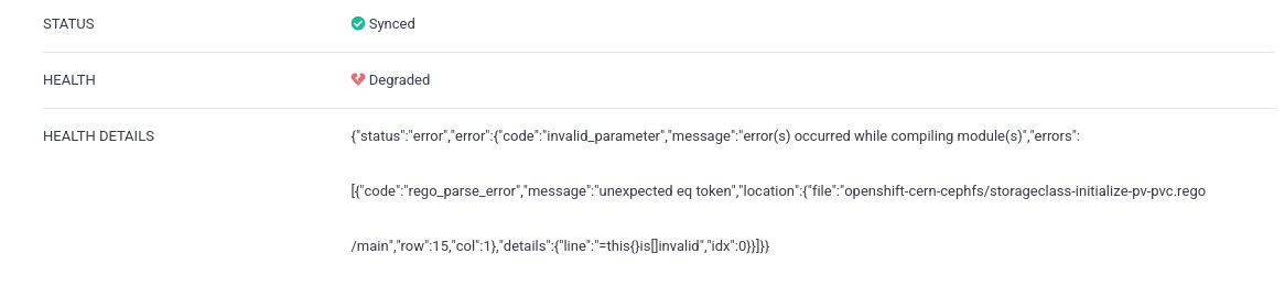 After ArgoCD reloads its configuration, it shows our OPA policy as “Unhealthy”!
