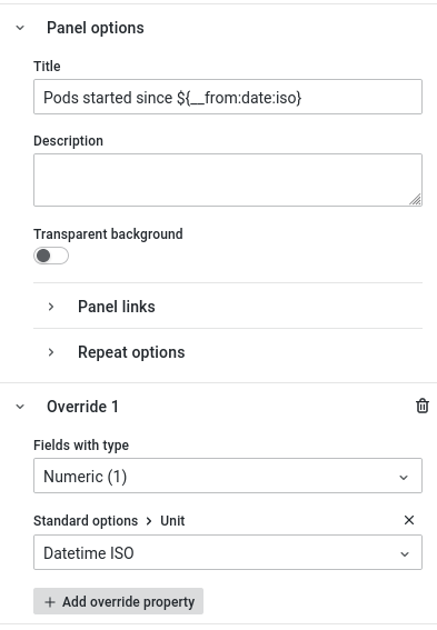 To wrap it up, we can put the query into a Grafana Dashboard Panel which also gives us the option to automatically format the epoch second values into proper date timestamps: