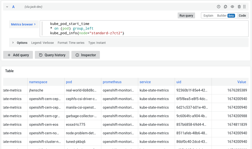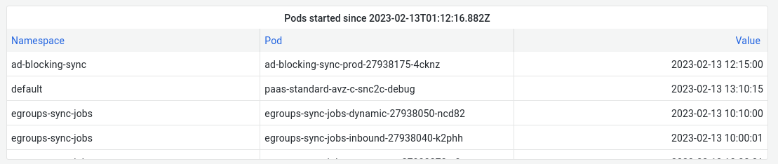 Luckily, there’s also the kube_pod_start_time metric, which value indicates when a pod was started.