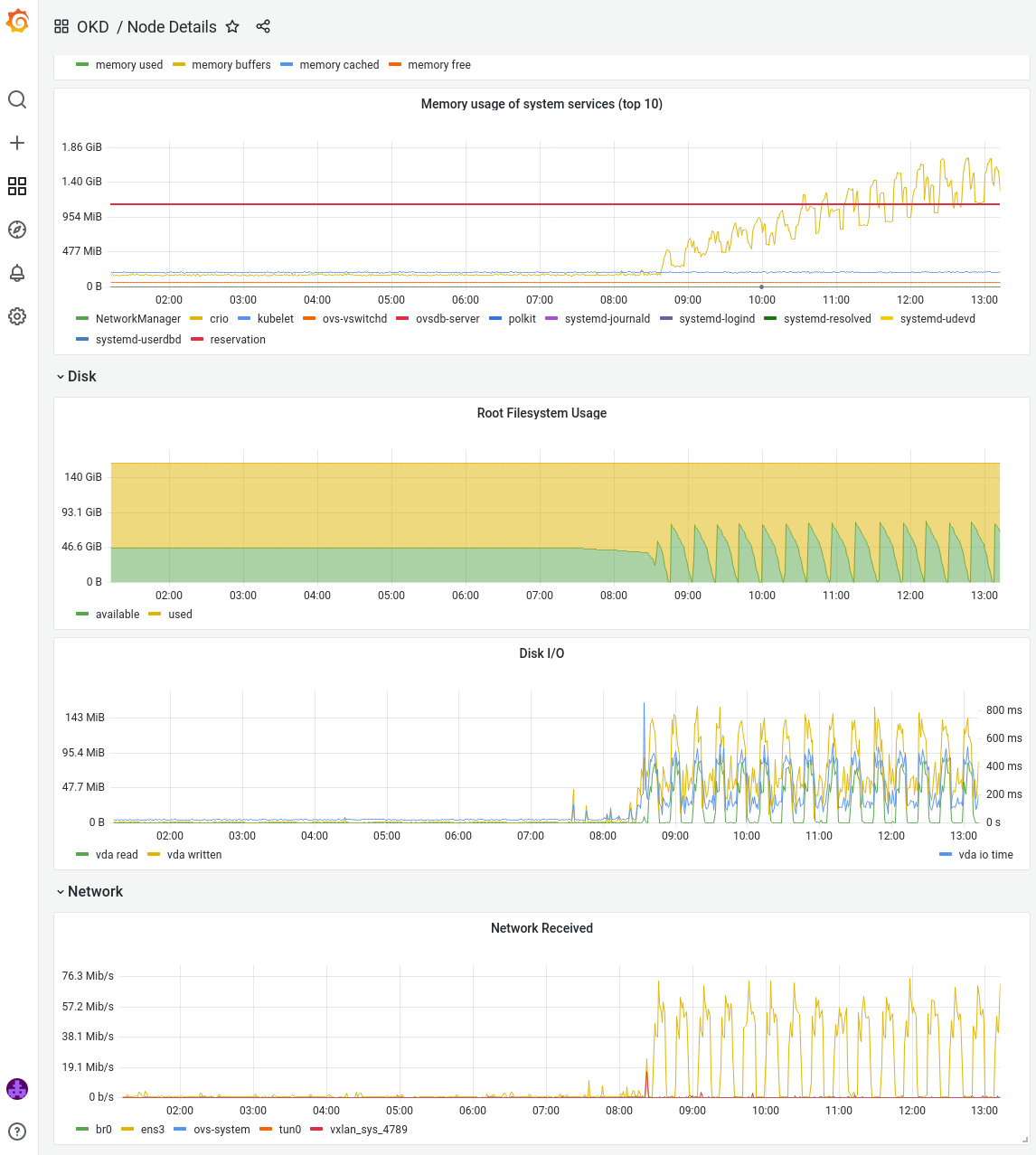In short and strong burst, the node is performing a lot of network and disk operations. Meanwhile, the available free disk space (green in the graphic) quickly drops to almost zero. And with each cycle there is a significant increase in memory consumption of CRI-O (the container runtime used by OKD).