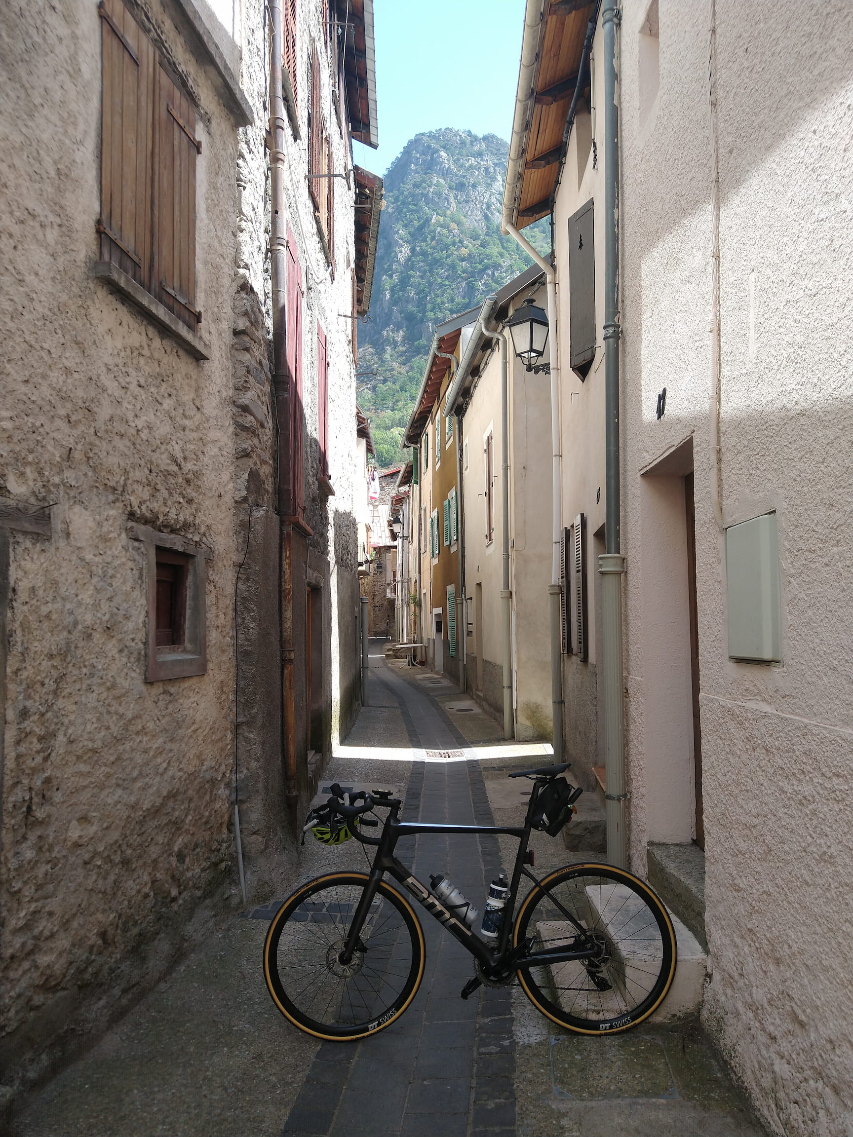 A tiny street in Isola with a bike for size comparison