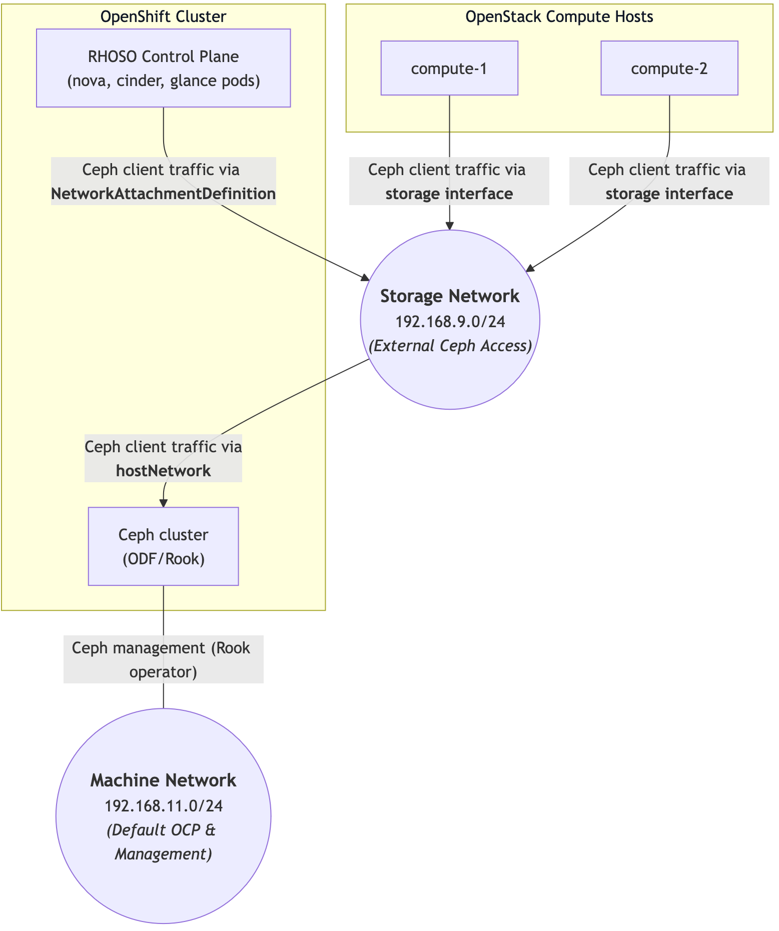 This means that the RHOSO control plane could create and use PersistentVolumeClaims (PVCs) for its services such as nova, keystone and friends, the compute nodes would not be able to access the Ceph storage where disk images, block volumes etc. are stored.
