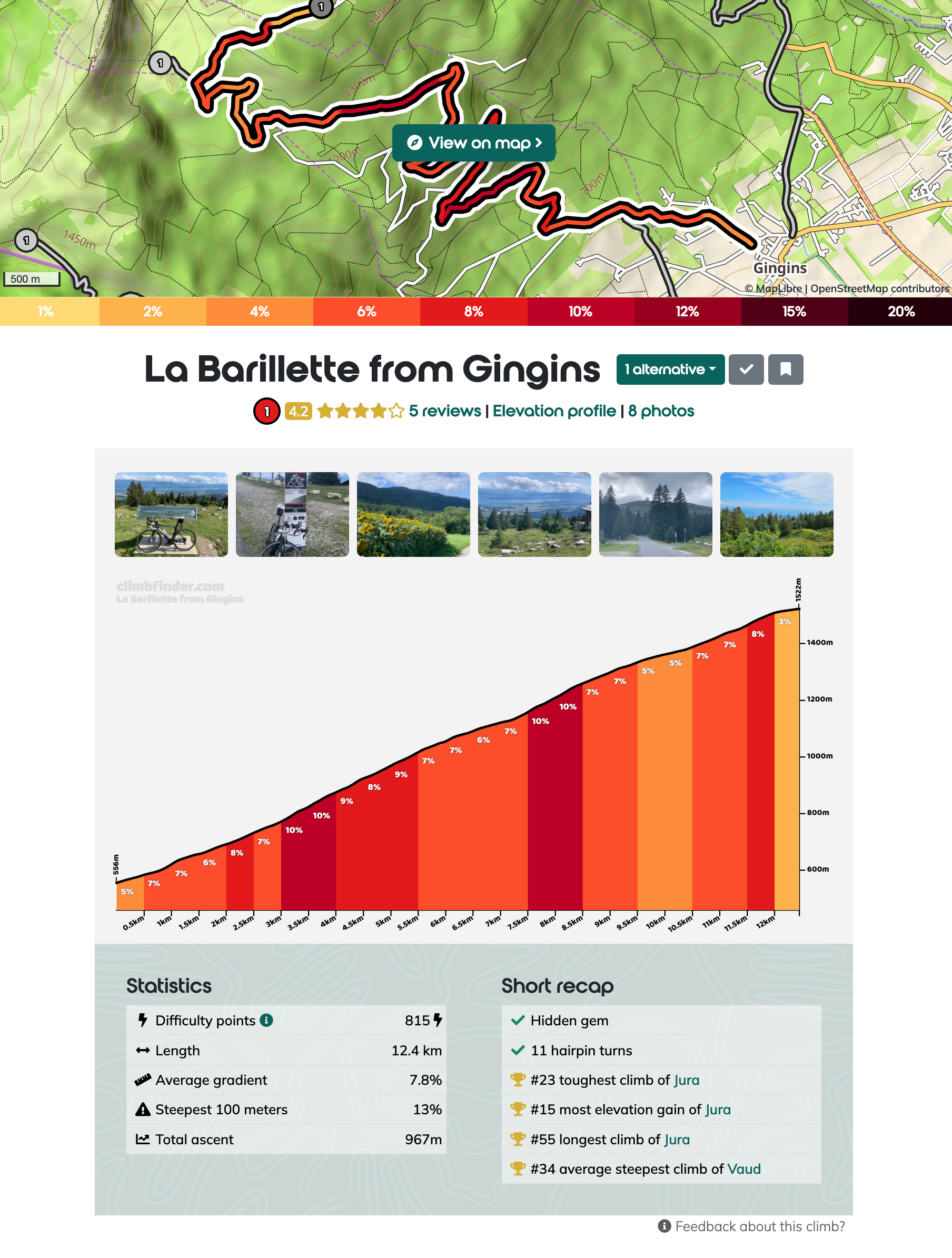The final tool isn’t a route planner, but it’s an indispensable resource for anyone who loves climbing: Climbfinder. When you’re planning a trip in the mountains, a map can be deceiving. A road might look like a simple line with a couple of twists and turns, but in reality it could be a grueling 10-kilometer ascent with a 10% average gradient. Or maybe you’re like me and you’re actively looking for these climbs.