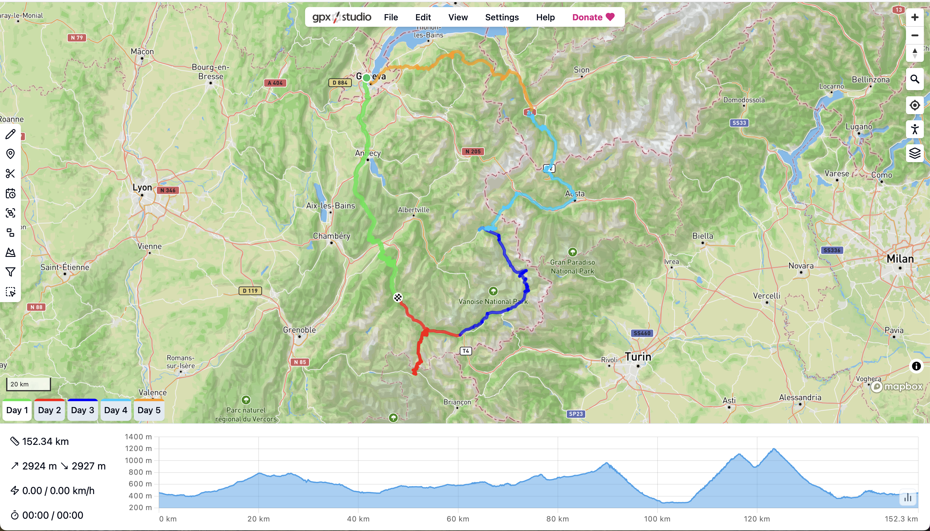 What I particularly love about GPX.Studio is its ability to manage multiple routes in a single session. This was a game-changer when I was planning my Route des Grandes Alpes trip in 2023 (and several times since then). I could lay out each day’s stage as a separate segment, see the whole tour at a glance, and adjust the start and end points to balance the efforts and find suitable accommodations.