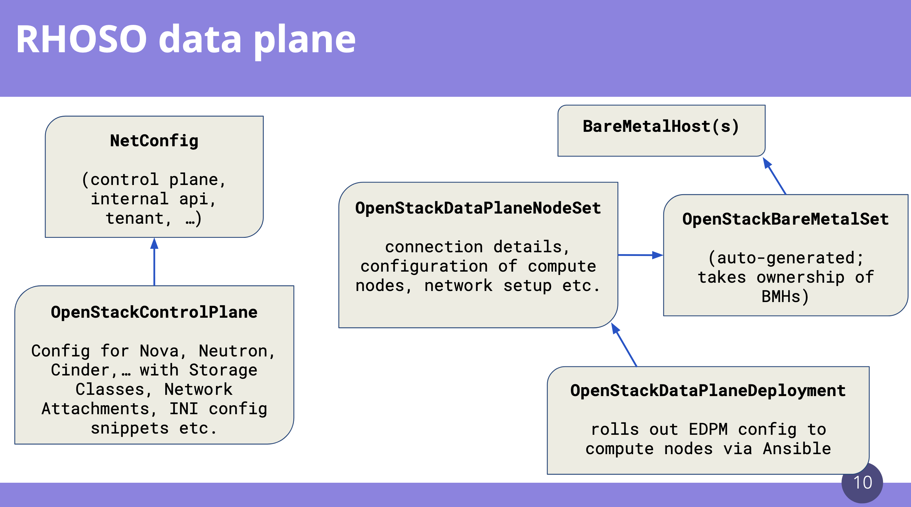 • The Provisioning Flow: The technical details of how the data plane gets provisioned, from discovering bare metal hosts with the Metal³ operator to configuring them with the OpenStack Data Plane Node set.